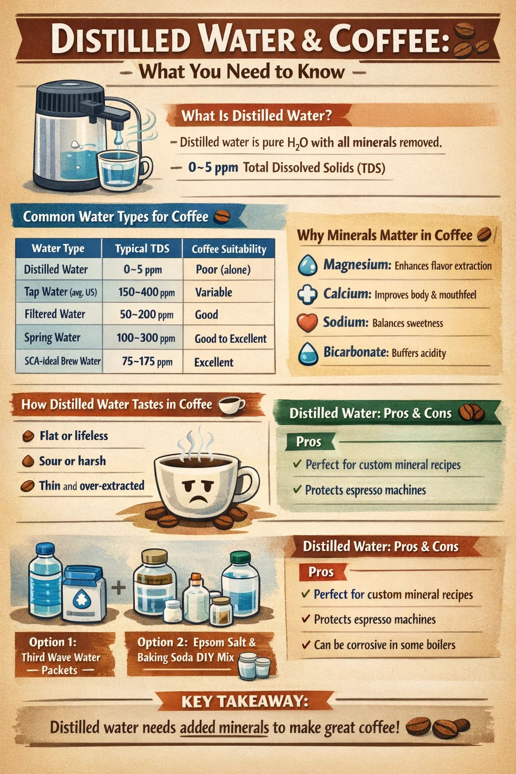 Ja, du kan lage kaffe med destillert vann - men du bør nok ikke stole utelukkende på det. Destillert vann er 100 % ren H2O med alle mineraler fjernet , som høres ideelt ut for en ren kopp, men kaffeekstraksjon avhenger faktisk av mineraler som magnesium og kalsium for å trekke smaksforbindelser ut av terrenget. Uten dem kan kaffen smake flatt, surt eller hult - teknisk brygget, men mangler noe. Når det er sagt, har destillert vann sin plass, spesielt når det blandes med mineralrikt vann eller når du eksperimenterer med total kontroll over bryggkjemien din.