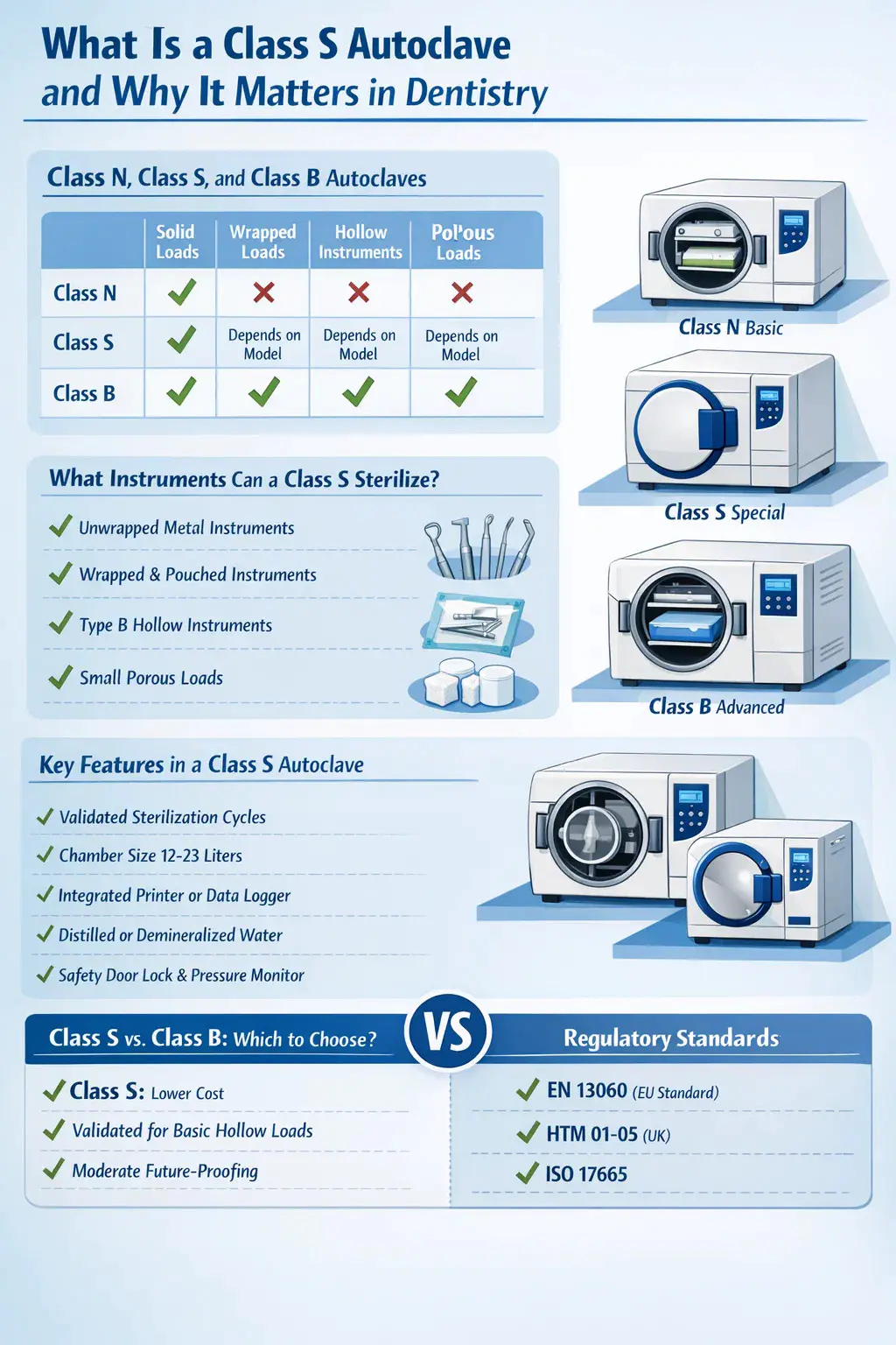 En Klasse S-autoklav er en dampsterilisator designet for å håndtere et spesifikt, produsentdefinert spekter av belastninger - som sitter mellom den grunnleggende Klasse N og den fullt kapable Klasse B når det gjelder steriliseringsytelse. I tannlegepraksis, Klasse S autoklaven er en av de mest brukte steriliseringsenhetene , fordi den tilbyr en praktisk balanse mellom kostnad, syklushastighet og evnen til å behandle hule og porøse instrumenter som er standard i enhver tannklinikk.