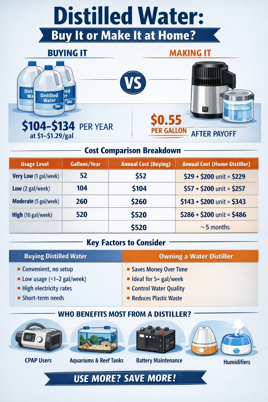 CPAP-produsenter anbefaler universelt destillert vann i luftfukterkamre for å forhindre mineraloppbygging og bakterievekst. En typisk CPAP-bruker fyller kammeret hver natt - omtrent 0,5 til 1 liter per bruk - og bruker omtrent 1 gallon (3,8 liter) per uke. Det er 52 liter per år. For $1,00/gallon fra butikken, bruker du $52 årlig bare på CPAP-vann. Med en vanndestiller som kjører på $0,50/gallon all-in, bruker du $26/år på CPAP-vann etter tilbakebetaling. I løpet av en 5-års periode på en $200 destilleri, kommer de totale kostnadene for hjemmedestillasjon for CPAP alene til ca. $330 vs. $460 for butikkkjøpt – ca 30 % besparelse. Hvis du også bruker destilleriet til andre formål, vil besparelsene raskt sammensettes.
