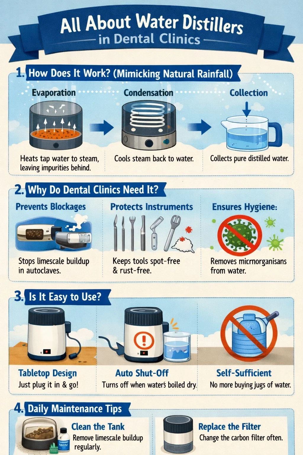 A vanndestilleri er egentlig en liten fabrikk dedikert til å produsere "rent vann." På tannklinikker er det vanligvis den beste partneren for tannautoklaver, fordi autoklaver er veldig "kresne" når det gjelder vannet de bruker og kan bare bruke dette rene destillerte vannet.