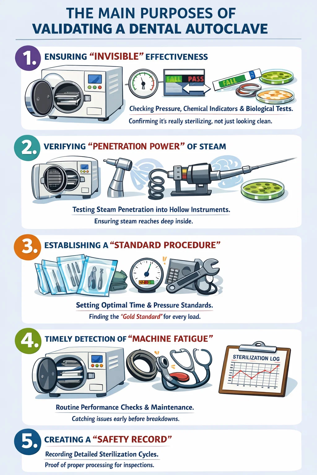 Valideringen av en tannautoklav , enkelt sagt, er å gi en "dobbel garanti" for steriliseringseffekten. Selv om maskinen går hver dag, sikrer validering at den utfører jobben sin effektivt hver gang.